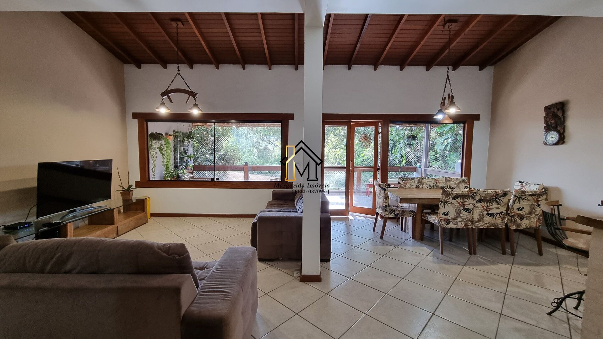 Total de 4 banheiros. A sala é ampla e possui 3 ambientes, com uma sacada integrada à sala, que oferece uma linda vista da parte inferior da casa. A área externa conta com um amplo espaço gramado, um espaço gourmet coberto, uma horta e um pomar.