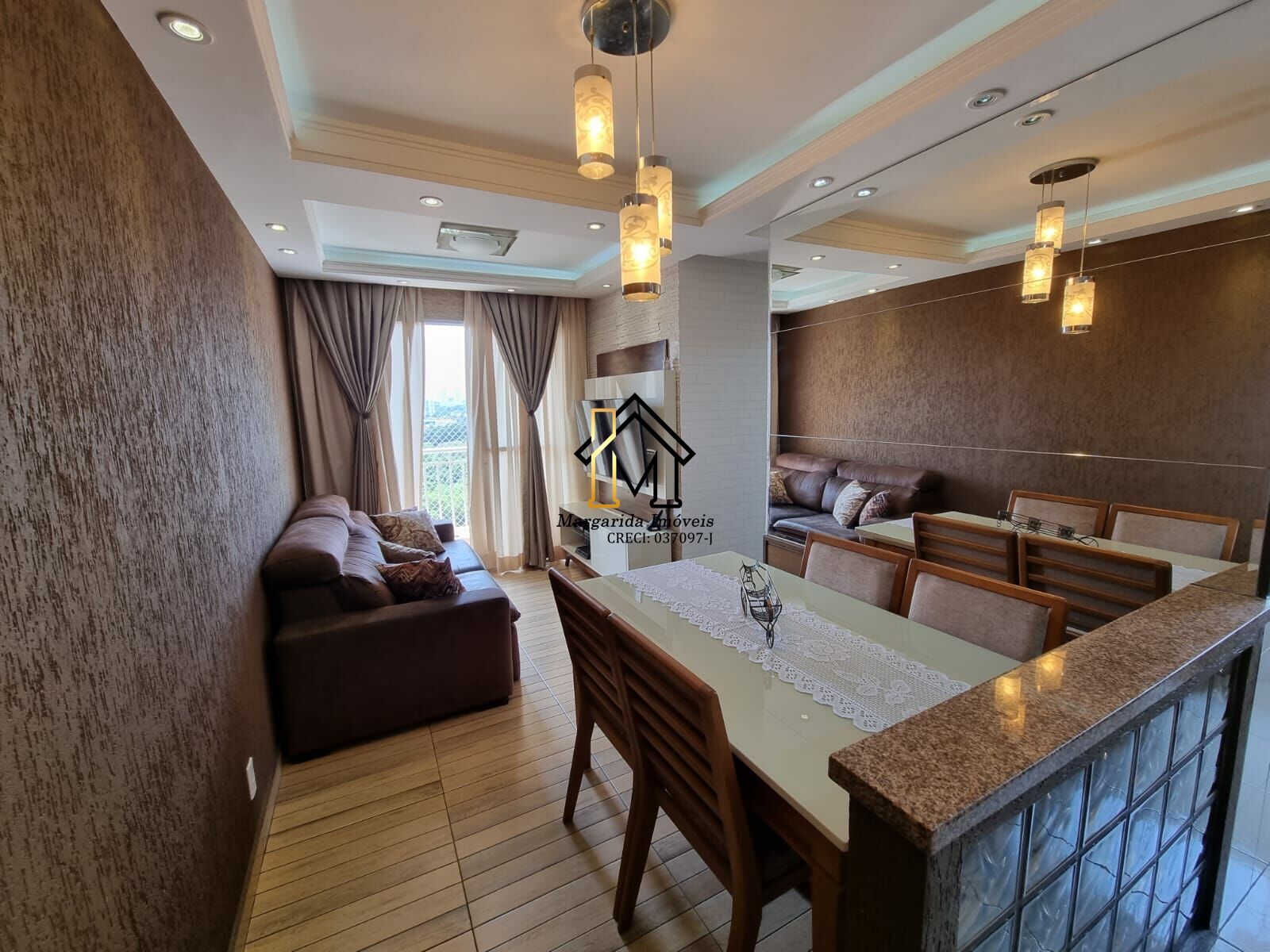 - Sala de estar com espelho, parede canjiquinha, painel de madeira, bancada com granito e tijolinho de vidro.